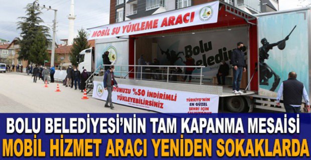 Bolu Belediyesi tam kapanma sürecinin başlamasıyla birlikte kesintisiz belediye hizmeti sunmak için Mobil Hizmet Aracı'nı devreye aldı. Su yüklemeleri ve vergi ödemelerinin yapılabileceği mobil araç 3 Mayıs Pazartesi gününden itibaren hizmet vermeye başlayacak.