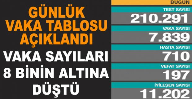 Vaka sayıları 7 bin 839'a düştü. Bununla beraber toplam vaka sayısı 5 milyon 186 bin 487 oldu. Gün içinde koronavirüs nedeniyle hayatını kaybedenlerin sayısı 197 oldu. Bugün iyileşen 11 bin 202 kişiyle beraber toplam iyileşen kişi sayısı 5 milyon 24 bin 313 oldu. Ağır hasta sayısı ise bin 843 olarak belirlendi.