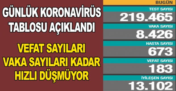 Vaka sayıları 8 bin 426'ya düştü. Bununla beraber toplam vaka sayısı 5 milyon 220 bin 549 oldu. Gün içinde koronavirüs nedeniyle hayatını kaybedenlerin sayısı 183 oldu. Bugün iyileşen 13 bin 102 kişiyle beraber toplam iyileşen kişi sayısı 5 milyon 70 bin 815 oldu. Ağır hasta sayısı ise bin 504 olarak belirlendi.