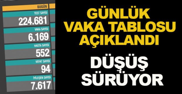 Bakanlığın paylaştığı tabloya göre bugün yapılan testler sonucu 6 bin 169 yeni vaka tespit edildi. Vakalar arasında ise 552 semptomlu hasta belirlendi.