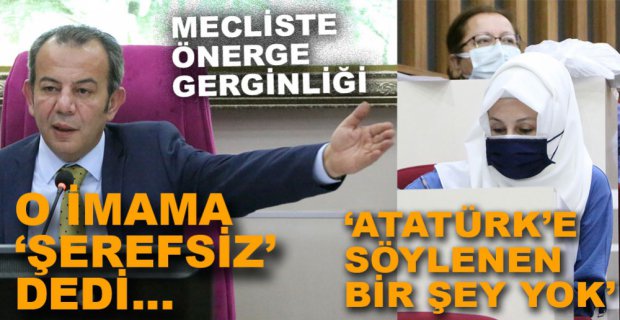 Bunun üzerine bir açıklama yapan Tanju Özcan, “Atatürk bu ülkenin kurucusudur. Atatürk’e bu ülkede ‘deccal’ diyenler bile oldu. Atatürk’ü seversiniz ya da sevmezsiniz. O benim bileceğim bir iş değil. Kendisini Halife gibi gören Ayasofya imamı, ‘Bir asır gibi bir zaman içerisinde ezan ve namaz yasaklandı. Bunlardan daha zalim ve kafir kim olabilir. Yarabbi bir daha bu zihniyetin bu milletin başna gelmesine fırsat verme.’ Adam Atatürk’e kafir diyor. Sen ne hakla bunu söylüyorsun. Bu ülkenin kurucusuna hakaret ettirmeyiz. Sen Ayasofya imamısın. Devletin bir memurusun. Atatürk’ün kurduğu Diyanet İşleri Başkanlığı tarafından bu ülkenin vatandaşınca maaşı verilen bir kişisin. Bu önergeye ret oyu veren hanımefendiyi de kınıyorum. Bugün Bolu Belediyesi Meclisi koltuğunda Atatürk’ün kadınlara verdiği seçme ve seçilme hakkı sayesinde oturuyor. Atatürk’e dil uzatan bu şerefsizin söylediklerine karşı ‘Atatürk’e söylenen bir şey yok’ diyorsanız size diploma veren okul müdürüyle bu konuyu tartışmamız lazım.” dedi.