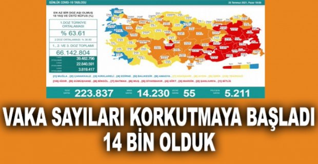 Buna göre; Türkiye'de son 24 saatte 223 bin 837 Kovid-19 testi yapıldı, 14 bin 230 kişinin testi pozitif çıktı, 55 kişi hayatını kaybetti.