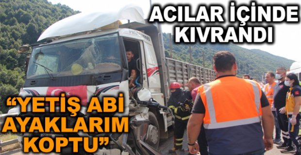 Bolu’da, TEM Otoyolu Bolu Dağı geçişinde önünde ilerleyen tıra çarpan kamyonun sürücüsü sıkıştığı yerden 1 saatte kurtarılabildi. Acılar içinde kurtarılmayı bekleyen sürücü ağabeyini arayarak, “Yetiş ağabey ayaklarım koptu. Annem, babam duymasın” dedi.