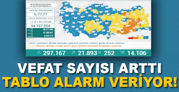 Buna göre; Türkiye'de son 24 saatte 297 bin 167 Kovid-19 testi yapıldı, 21 bin 893 kişinin testi pozitif çıktı, 252 kişi hayatını kaybetti.