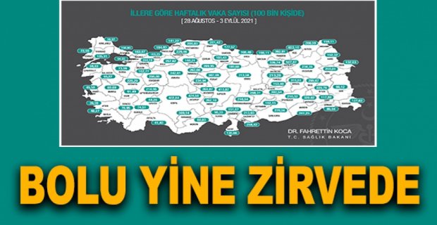 Sağlık Bakanı Fahrettin Koca, 28 Ağustos-3 Eylül arasında illere göre her 100 bin kişide görülen koronavirüs vaka sayılarını paylaştı. Bolu Eylül ayında da artmaya devam ederek, 257,62 vaka oranıyla en yüksek 4’üncü il oldu.