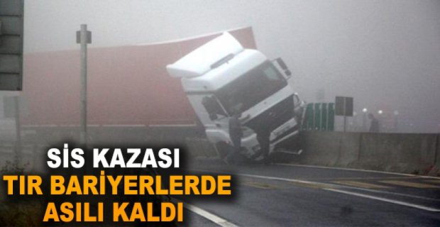 Bolu'da, yoğun sisin etkili olduğu D100 karayolu Bolu Dağı kesiminde kontrolden çıkan tır, refüjde bulunan beton bariyerlerin üzerine çıkarak asılı kaldı.