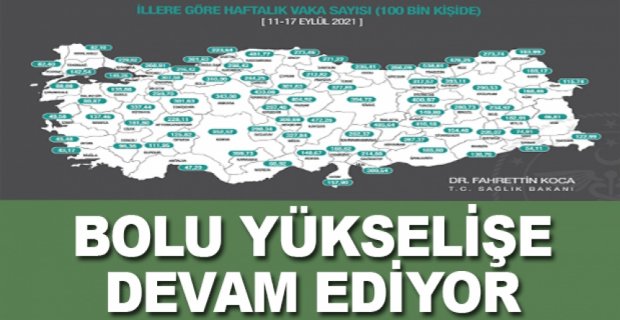 Sağlık Bakanlığı ülke genelindeki pozitif hasta sayısını açıkladı. Son açıklanan verilere göre Bolu’da vaka sayısı 4-10 Eylül arasında 277.63 iken açıklanan son verilere göre bu rakam 11-17 Eylül arası 100 binde 310.99’a yükseldi. Son verilere göre açıklanan rakamlarda Bolu’daki vaka sayısının 300’leri görmesi dikkat çekti.
