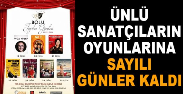 Bolu’da 19-25 Ekim arasında düzenlenecek ve ünlü sanatçıların sahne alacağı tiyatro oyunlarına sayılı günler kalırken biletlerin birçoğu tükendi.