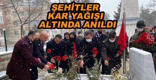 Yoğun kar yağışı altında düzenlenen programda saygı duruşu ve İstiklal Marşının okunmasının ardından şehitler için 3 kez saygı atışı yapıldı. Törende konuşan Binbaşı Ali Çınar, "Kutsal vatan topraklarının bölünmez bütünlüğü, milletimizin egemenlik ve bağımsızlık uğruna canlarını feda eden isimlerini kalbimize yazdığımız aziz şehitlerimizi bu anlamlı günde rahmet ve minnetle yad ediyoruz. Aynı zamanda bugün 107. yıl önce 18 Mart 1915'te şanlı ordumuzun Çanakkale'nin geçilmeyeceğini tüm dünyaya gösterdiği destansı bir zaferin, Çanakkale Deniz Zaferi'nin de yıldönümüdür. Tüm yokluk ve imkansızlıklara rağmen milletimizin kahraman evlatlarının emsalsiz fedakarlıklarıyla kazanılan bu zafer milli mücadelemize ilham verirken Türkiye Cumhuriyeti'nin kuruluşuna giden yolda çok önemli bir kilometre taşı olmuştur" dedi.