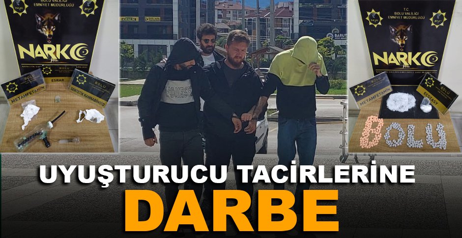 Bolu Emniyet Müdürlüğü Narkotik Suçlarla Mücadele ekipleri tarafından uyuşturucu tacirlerine yönelik operasyonlar sürüyor. Narkotik ekipleri tarafından uyuşturucu madde sevkiyatı yaptığı belirlenen şüphelilere yönelik operasyon düzenlendi. Polis ekipleri tarafından durdurulan araç didik didik arandı. Yapılan aramalarda şüphelilerin eşyalarında ve aracın gizli bölümlerine saklanmış 273 adet sentetik uyuşturucu Ecstasy hap, 3 parça halinde 80 gram Metamfetamin, 2 parça halinde 2.18 gram Sentetik Kannabinoid ( Bonzai ) ile 1 parça halinde 6.57 gram esrar ile uyuşturucu madde içiminde kullanılan cam aparat, 1 adet uyuşturucu madde içiminde kullanılan pet şişe düzeneği ele geçirildi. Olayla ilgili 6 şüpheli gözaltına alındı.