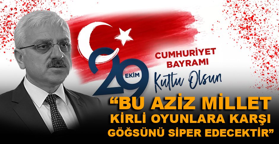 Vali Kılıç, devamında, “29 Ekim 1923 tarihi; geleceği ve iradesi vesayet altına alınmak istenen, vatanı parçalanmak istenen bir milletin bağımsızlığına yönelik tehditleri azim ve kararlılıkla bertaraf ettiği, bağımsızlığının ve hür iradesinin tescillendiği, bin yıldır üzerinde hür yaşadığı toprakları ebedi vatan haline getirdiği gündür. Hiç şüphe yoktur ki; geçmişinde olduğu gibi bugün de bu aziz millet, ay yıldızlı al bayrağımızın gölgesi altında hür ve kardeşçe yaşamak için, ülkemizi, demokrasimizi ve bağımsızlığımızı hedef alan her türlü tehlikeye ve birlik beraberliğimizi bozmak üzerine kurulan kirli oyunlara karşı tek vücut olup göğsünü siper edecektir. Nice bedeller ödenerek ecdadımızın büyük fedakârlıkları ve cesaretiyle kurulan ve 99. yıl dönümünü birlik ve beraberlik ruhuyla idrak ettiğimiz Türkiye Cumhuriyeti Devleti’ni ilelebet payidar kılmak için var gücümüzle çalışmak, bizlere bu cennet toprakları vatan kılan aziz şehitlerimize ve kahraman gazilerimize olan borcumuzun gereğidir” diye konuştu.