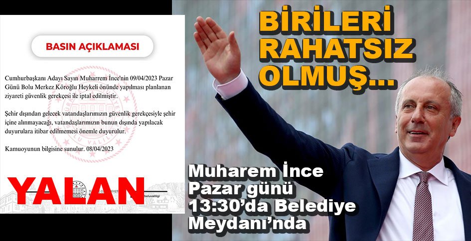 Cumhurbaşkanı adayı ve Memleket Partisi Genel Başkanı Muharrem İnce’nin Pazar günü saat 13:30’da Bolu Belediye Meydanı’nda seçim startını vereceği basın açıklamasının güvenlik gerekçesiyle iptal edildiğine dair asılsız bir metin vatandaşlara gönderilirken, Bolu Valiliği’nde yapılan yazılı açıklamada İnce'nin aynı gün ve saatte basın açıklamasını yapacağı belirtildi.