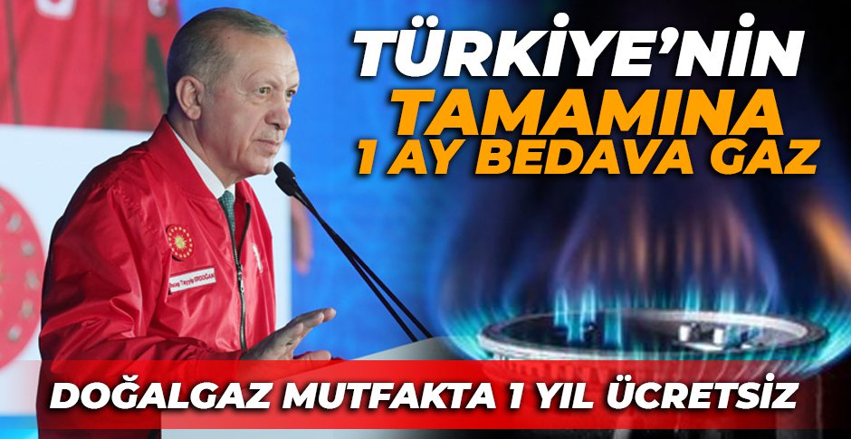 Cumhurbaşkanı Recep Tayyip Erdoğan, "1 ay boyunca Türkiye'nin tamamındaki konutların doğalgaz tüketiminden ücret almayacağız. Yani mutfağın ve sıcak suyun yanı sıra ısınma dahil doğalgaz tüketimini tamamını 1 ay süreyle ücretsiz yapıyoruz. Aylık ortalama 25 metreküpe gelen doğalgaz tüketimi harcaması bir yıl boyunca faturalardan düşecek" dedi.