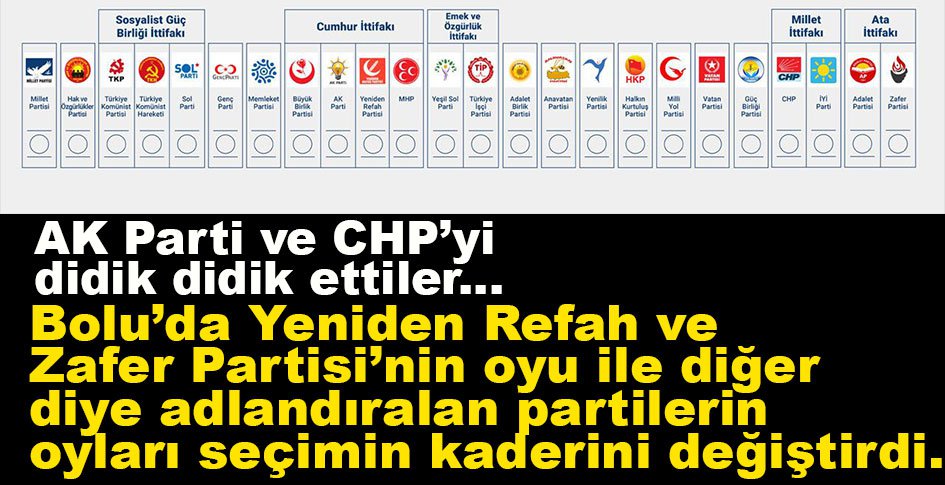 Bolu’da, AK Parti, MHP, CHP ve İYİ Parti’den sonra listede diğer partiler adlandırılan 19 parti toplam 21 bin 966 oy alarak seçimin kaderini belirledi. Yeniden Refah Partisi, Zafer Partisi ve Memleket Partisi’nin aldığı oylar dikkat çekti.