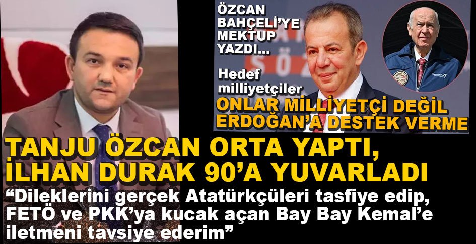 Bolu Belediye Başkanı Tanju Özcan’ın twitter hesabından MHP Genel Başkanı Devlet Bahçeli’ye yazdığı mektuba, MHP İl Başkanı İlhan Durak’tan cevap geldi. Durak, “Dileklerini Cumhuriyetçileri ve gerçek Atatürkçüleri tasfiye edip, FETÖ ve PKK’ya kucak açan Bay Bay Kemal’e iletmeni tavsiye ederim” dedi.