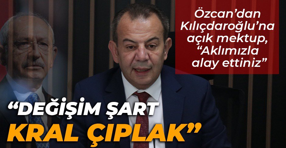 Bolu Belediye Başkanı Tanju Özcan, CHP Genel Başkanı ve son seçimlerde Cumhurbaşkanı adayı olan Kemal Kılıçdaroğlu’na açık mektup yazdı. Özcan, “Ben ne yapabilirim liderler karar verdi’ demek suretiyle aklımızla alay ettiniz. Şimdi herkes başını kuma gömmüş bekliyor. Ben başımı kuma gömmüyorum. Başarısız olduk. Değişim şart ve kral çıplak” dedi.
