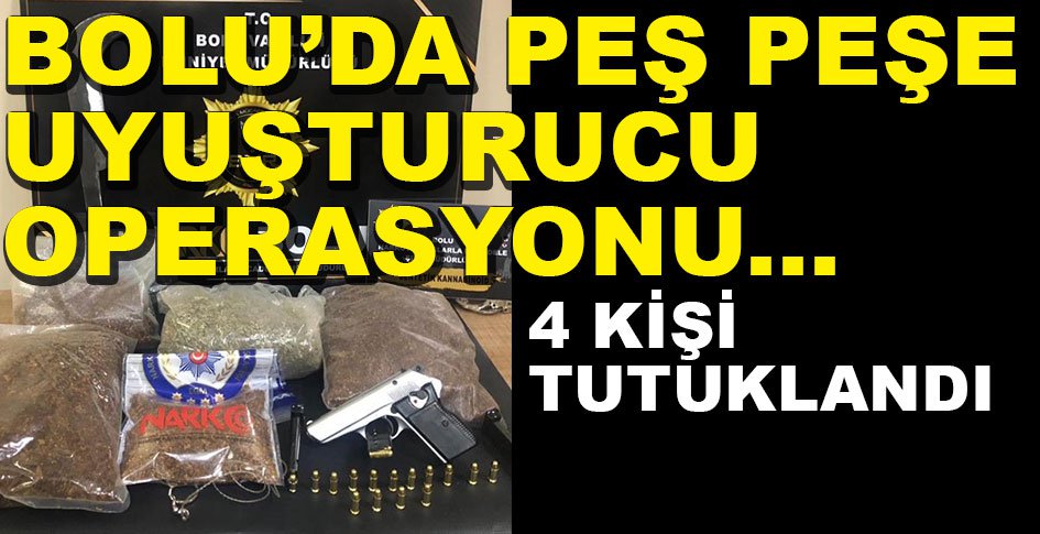 Bolu’da, polis ekipleri tarafından düzenlenen 3 ayrı uyuşturucu operasyonunda 1 kilo 982 gram kannobinoid (bonzai) maddesi, 56.22 gram eroin ile tabanca ele geçirilirken, olayla ilgili 4 şüpheli tutuklandı.