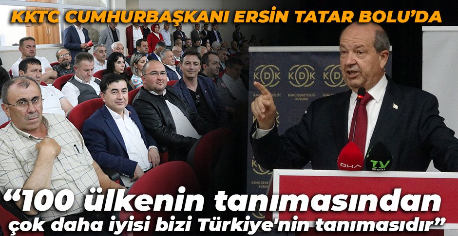 Bolu’ya KKTC’nin Kurucu Cumhurbaşkanı rahmetli Rauf Denktaş’ın heykelinin açılış töreni için geldiğini ifade eden Cumhurbaşkanı Ersin Tatar, “Rast geldi, Bolu’da Kurucu Cumhurbaşkanımız rahmetli Rauf Denktaş’ın büstünün açılış töreni dolayısıyla aldığım bir davet üzerine buradayım. Kuzey Kıbrıs Türk Cumhuriyeti esasında benim gönlümde Türkiye'nin ayrılmaz bir parçasıdır. Kendimizi malumunuz olduğu üzere büyük Türk milletinin bir parçası olarak görürüz. Hep öyle olarak böyle devam edecek. Dolayısıyla Bolu’da bu Anadolu'nun Türkiye'nin en güzel müstesna yerlerinden bir tanesinde bu güzel şehirde sizlere beraber olmak, onun bana nasip olması, böyle bir toplantıda bulunmak ve sizlere kısa da olsa bu hitabı yapmam benim için büyük bir onur, şeref, beni buraya daveti için hepinize teşekkür ediyorum” dedi.