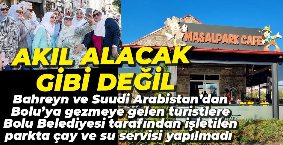 Bolu Belediyesi’nin şirketi olan Bolu Bel. A.Ş. tarafından işletilen Masal Park’ta geçtiğimiz gün akıl almaz bir olay yaşandı. Parkta bulunan restorana gelen 20 kişilik Bahreyn ve Suudi Arabistanlı turist kafilesine ücreti karşılında çay ve su servisi yapılmadı. Çalışanlar turistlere servis yapılmadığını ifade edince turist kafilesi büyük şok yaşadı. Olaya şirketin Genel Müdürü Özgür Yıldız müdahale etti ancak turistler kentten ayrıldılar.