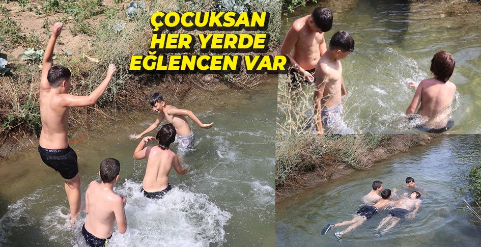 Kasaplar Mahallesi’nde bulunan sulama kanalı çocukların yüzme havuzu oldu. Sıcaklardan bunalan çocuklar çareyi sulama kanalına girmekte buldu. Kanal içerisinde yüzerek hem serinleyen hem de eğlenen çocuklar, suyun keyfini çıkardı. Tehlikeli olmasına rağmen kanal üzerinde bulunan köprüden de suya atlayan çocuklar, adeta aquaparktaymış gibi eğlendi.