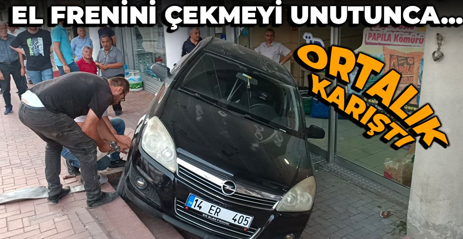 Bolu’da İzzet Baysal Caddesi’nde el freni çekilmeyen park halindeki bir araç yokuştan aşağı hareket ederek, önce bir otomobile ardından dükkana çarptı.