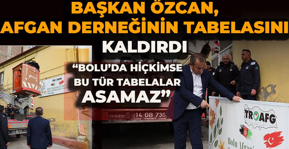 Bolu Belediye Başkanı Tanju Özcan, Bolu Afganistan Gençleri Sosyal Kültürel ve Yardımlaşma Derneği’nin tabelasını indirdi. Başkan Özcan, “Ben görevde olduğum sürece, bizden habersiz Bolu’da hiç kimse bu tür tabelalar asamaz, asamayacak.” dedi.