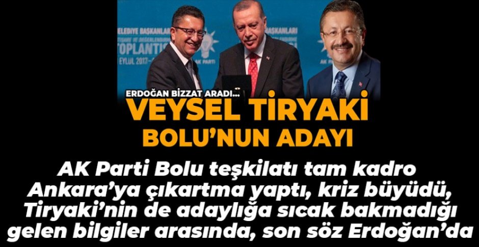 AK Parti’nin Bolu Belediye Başkan adayının kim olacağı merakla beklenirken, Özgür Bolu Gazetesi ve Bolu Gazetesi aslen Dörtdivanlı olan Altındağ eski Belediye Başkanı ve Tarım Orman Bakan Yardımcısı Veysel Tiryaki’nin Bolu Belediye Başkan adayı olacağını yazdı. Cumhurbaşkanı Erdoğan’ın Tiryaki’yi bizzat aradığı da paylaşmıştı.