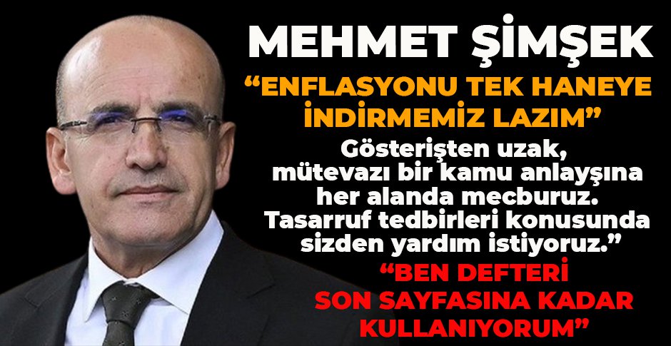 Bakan Şimşek, kendisinin de uyguladığı tasarruf yöntemlerinden bahsederek, “Bu hassasiyet o kadar değerli ki. Ben defterleri sonuna kadar kullanıyorum. Kağıt falan kullanmıyorum. Bu seviyeye kadar inmemiz lazım. Bu babamızın parası değil. Hepimizin parası, milletin parası. 2,7 trilyon lira açık vereceğiz arkadaşlar. Onun için lütfen tasarruf tedbirleri konusunda maksimum hassasiyet gösterin; bu konuda bize yardımcı olun. Gösterişten uzak, mütevazı bir kamu anlayışına her alanda mecburuz. Tasarruf tedbirleri konusunda sizden yardım istiyoruz.” ifadelerini kullandı.
