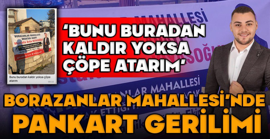 Borazanlar Mahallesi Muhtar Adayı Mustafa Arda Kıyasoğlu, seçim çalışmalarının mevcut muhtarın yönetimi tarafından engellendiğini iddia etti. Kıyasoğlu, “Mahallemizin sokaklarına asmış olduğum pankartlar sebebiyle mevcut muhtarın yönetimi tarafından bu sabah, ‘Bunu buradan kaldır yoksa çöpe atarım’ mesajını aldım. Seçim çalışmalarımız engellenmek isteniyor” dedi.