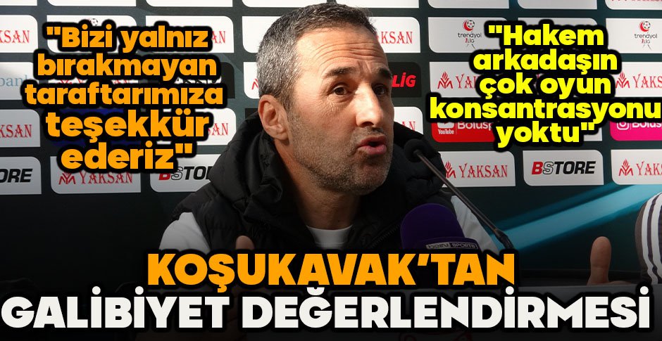 Hakeme yönelik sert eleştirilerde bulunan Koşukavak, “Kazanınca konuşmak lazım. Kaybedince konuşunca olmuyor. Türk futbolu gelişmez başka türlü. Bir oynamak isteyen bir Boluspor tamamen topu üçüncü bölgeye vurup düşen top kazanacak ya Erzurumspor. Orta sahada çok bariz bir faul oyuncumuza yapıldı. Oyuna aktı, devam etti. Unutturuldu. Rakip oyuncu, arkadan aldatmaya yönelik penaltı aradı. İki sarı kartla oyundan atılması gerekiyordu. Bunları neden anlatıyorum? Çünkü hakem arkadaşın çok oyun konsantrasyonu yoktu böyle 1980’de oynanan futbol sürekli topun havada olduğu oyunlarda futbol kuralları artık daha böyle ertelenir ve orada hakemin oyunu yorumlamasına kalır işler. Onları yapamadı hakem arkadaş maalesef. Çok oyunu yönetemedi, idare etti. O yüzden bunları söylemek zorundayım. Ülke futbolunun gelişmesi açısından. Bu kadar ekonomik anlamda yatırım yapılan bir futbol var bu ülkede. Üretemezsek oynayamazsak, ilk yarı herhalde bir file taksak sahaya, ayak tenisi oynasak yeri vardı. Sürekli top havadaydı, bir de topun oyunda kalması süresi herhalde hakemin sakatlığıyla beraber topun önünde kaldığı süre. Bu maçta bu top kaç dakika sahada kaldı? Bir tahminde bulunursam 15 dakika falandır. Bu çok acı bir şey. Bir tarafta oynamaya çalışan bir takımı biz bedavadan bize faul veya bir şey çalsın istemiyoruz. Ama bir takım oynamaya çalışıyor. Diğer takımı tamamen oynatmamaya çalışıyor. Burada kimden yana dikkatli davranmamız lazım, yorum yapmamız lazım. Böyle genç hakem arkadaşların biraz daha oyuna iyi yorumlar getirmesi, akıl getirmesi gerekiyor. Maalesef bugün göremedik. İnşallah ilerleyen zamanda gelişeceğiz. Umudumuz var” ifadelerini kullandı.