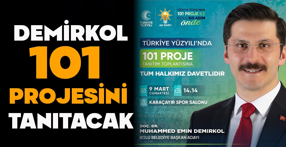 AK Parti Bolu Belediye Başkan Adayı Doç. Dr. Muhammed Emin Demirkol’un Bolu için planladığı projelerini tanıtmak amacıyla "Türkiye Yüzyılı'nda 101 Proje ile Bolu Bir Adım Önde" adlı tanıtım toplantısı 9 Mart Cumartesi günü saat 14.14'te Karacayır Spor Salonu'nda gerçekleştirilecek. Demirkol, tüm Boluları ve Bolu’ya gönül verenleri proje tanıtım toplantısına davet etti.