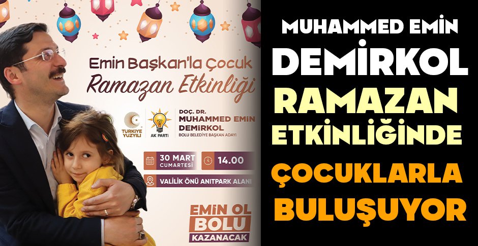 AK Parti Bolu Belediye Başkan Adayı Doç. Dr. Muhammed Emin Demirkol, seçim yorgunluğunu atmak ve çocuklarla keyifli vakit geçirmek için Ramazan Etkinliği düzenliyor. Anıt Park Tören Alanı'nda saat 14:00'te başlayacak etkinlikte, çocuklar için eğlenceli aktiviteler, dans gösterileri ve lezzetli ikramlar olacak.