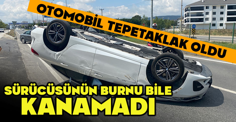 Bolu’da D-100 kara yolunda, kaldırıma çarpan otomobil tepetaklak oldu. Meydana gelen kazada sürücünün burnu bile kanamadı.