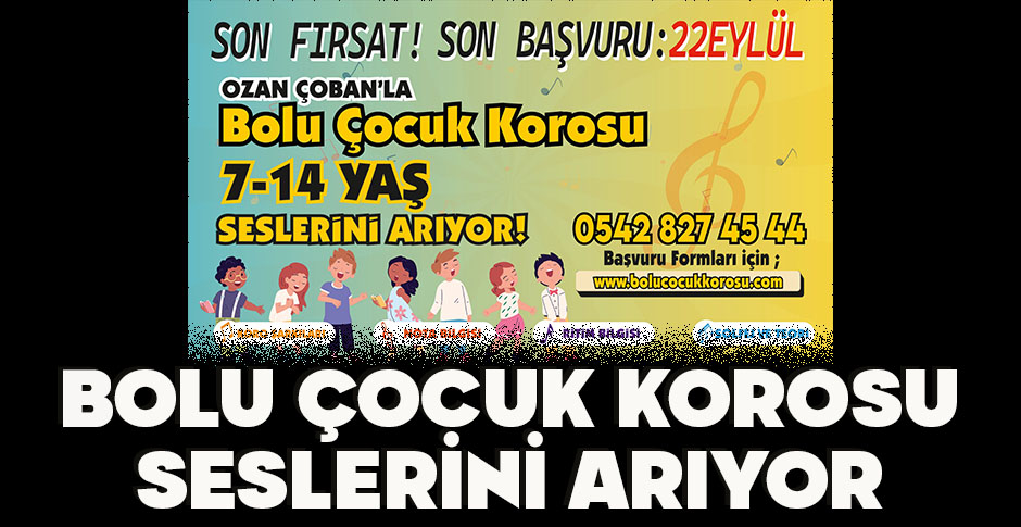 Bolu Çocuk Korosu yeni sesleri bünyesine katmaya hazırlanıyor. Bolu Çocuk Korosu'nda, nota bilgisi, ritim bilgisi, solfej ve koro şarkıları alanındaki eğitimler Piyano Sanatçısı Ozan Çoban tarafından verilecek. 7-14 yaş gurubu çocuklar için geçerli olan başvrular için son tarih 22 Eylül. Bolu Çocuk Korosu başvuruları www.bolucocukkorosu.com adresinden yapılabilecek.