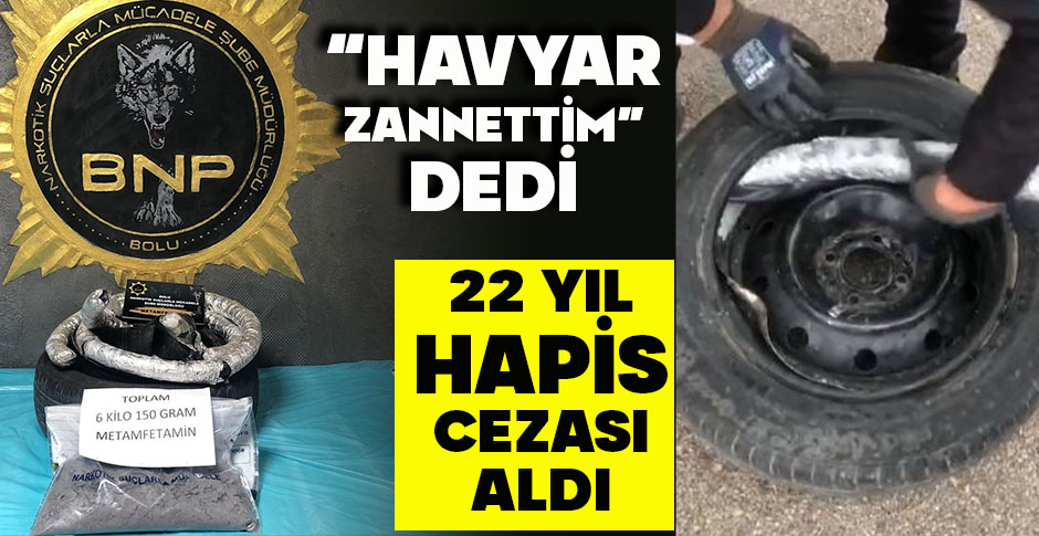 Bolu'da geçtiğimiz şubat ayında aracının lastiğinden çıkan 6 kilo 150 gram metamfetamin maddesi ile yakalanan şahıs karar duruşmasında, aracına başka kişiler tarafından paketli halde konulan uyuşturucu maddelerin havyar olduğunu zannettiğini söyledi. Mahkeme heyeti tarafından sanığa 22 yıl hapis cezası ve 60 bin lira para cezası verildi.