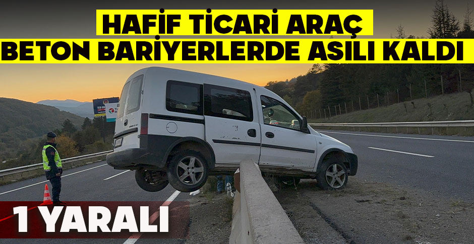 Bolu’da D-100 kara yolunda kontrolden çıkan hafif ticari araç, beton bariyerde asılı kaldı. Meydana gelen kazada araç içerisinde yolcu konumunda bulunan bir kişi yaralandı.