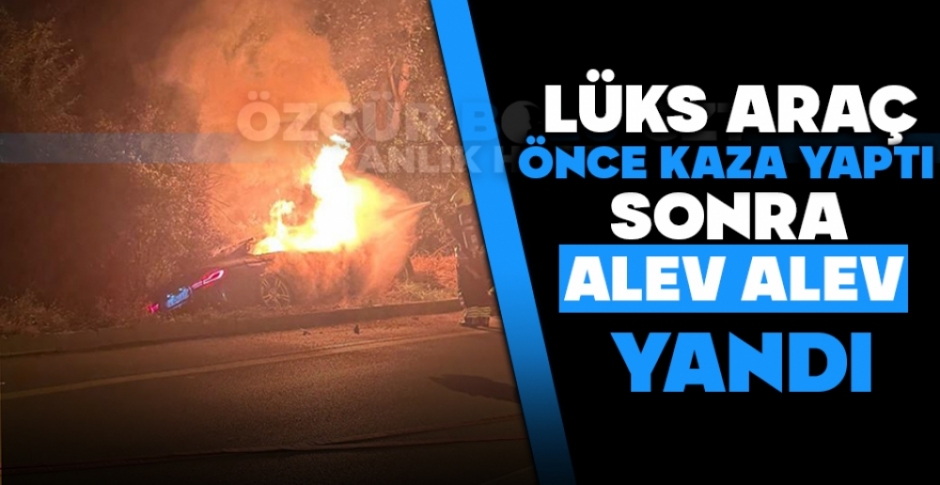Bolu'da yol kenarındaki ağaçlara çarpan lüks otomobil, kazanın ardından alev alev yandı. Sürücü kazayı yara almadan atlatırken araç kullanılamaz hale geldi.