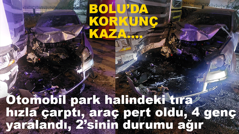 Bolu’da gece saatlerinde korkunç bir trafik kazası meydana geldi. İçinde 4 gencin bulunduğu otomobil sürücünün direksiyon hakimiyetini kaybetmesi sonrasında yol kenarında park halindeki tıra hızla çarptı. Kazada otomobil pert olurken, araçta bulunan 4 genç yaralandı. Yaralılardan 2’sinin durumunun ağır olduğu ifade edildi.