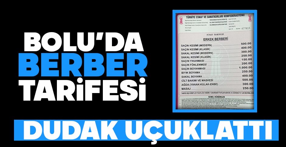 Bolu Berberler ve Kuaförler Odası’nın açıkladığı yeni fiyat tarifesi görenleri şaşırttı. Fiyat tarifesine göre saç ve sakal kesimi, saç yıkama, saçın kurutulması ve yanak-kulak-ense traşı gibi temel hizmetleri alan bir kişi 1450 TL para ödeyecek.