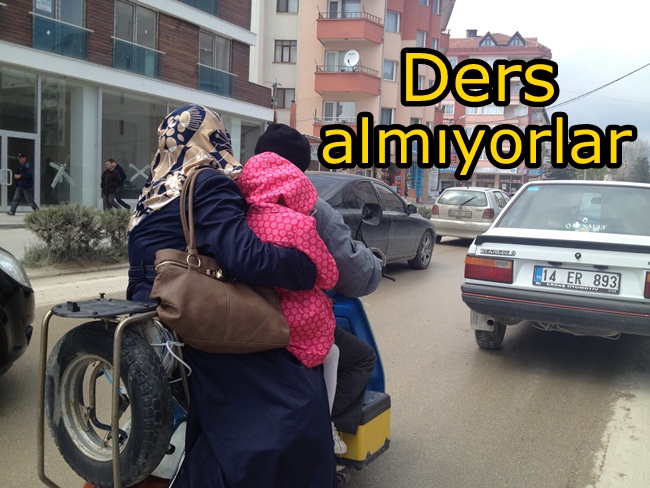 Karaçayır Mahallesi'nden Hükümet Meydanı'na giden yolda ilerleyen bir motosiklet sürücüsü görenleri şaşırttı. Trafiğin arasında seyreden motosikletin arkasında bir kadın ve küçük çocuk dikkat çekti. Sürücü ile kadın yolcunun arasına sıkıştırılan çocuk tehlikeli yolculuğa eşlik etti. Yolculuk sırasında kadının kucağındaki çocuğu sadece tek eliyle tutması ise bu kadar vurdumduymazlık olmaz dedirtti. Herkesin şaşkın bakışlarla izlediği motosiklet sürücüsü ise tehlikeye aldırmadan trafiğin arasına karışıp yoluna devam etti. Türkiye'de onlarca motosiklet kazasında insanların hayatını kaybetmesinin vatandaşlara ders olmadığı bir kez daha gözler önüne serildi.