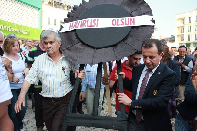 Milletvekili Tanju Özcan'ın konuşmasının ardından yürüyüşe geçen grup Belediye Binası önüne geldi. Tanju Özcan'la birlikte Merkez İlçe Başkanı Faruk İyigün, belediyenin giriş kapısına siyah çelenk bıraktı.