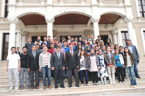 Öğrencileri valilik girişinde karşılayan ve hatıra fotoğrafı çektiren Vali Özçimen, sonra öğrencilerle birlikte Abant Toplantı Salonu'na çıktı.