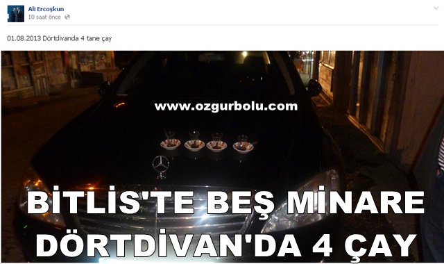 Dörtivan'da esnafları ziyaret edip, iftar yemeğine katılan Ak Parti Bolu Milletvekili Ali Ercoşkun, gecenin ilerleyen saatlerine kadar gezilerine devam etti. Ali Ercoşkun iftarın ardından vatandaşlarla sohbet ederken, yardımcıları ise vekili beklerken çay içerek zaman geçirdi. Bu esnada ortaya Ali Ercoşkun'un, 14 AK 444 plakalı Mercedes marka otomobilinin ön kaputunun üzerinde 4 çay bardağı yan yana gelirken, vekilin Facebook'taki sayfasında "Bitlis'te beş minare" veya "1 mumdur, 2 mumdur" şarkısından etkilenerek, "Dörtdivan'da 4 tane çay" başlığıyla paylaşıldı.