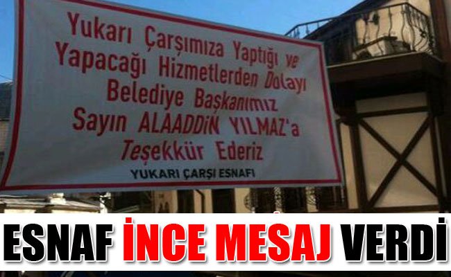 Yukarı Çarşı esnafı astığı pankart ile kamuoyuna ince bir mesaj verdi. Yukarı Çarşı'nın iki noktasına asılan pankartta, 'Yukarı Çarşımıza yaptığı ve yapacağı hizmetlerden dolayı Belediye Başkanımız Sayın Alaaddin Yılmaz'a teşekkür ederiz. Yukarı Çarşı Esnafı' ifadesi yer aldı.