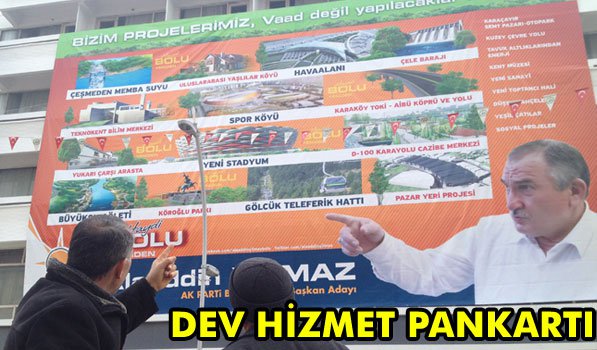 Görev yaptığı 10 yıl süreçte Bolu'nun çehresinin değiştiren Bolu Belediye Başkanı ve Ak Parti Belediye Başkan Adayı Alaaddin Yılmaz, yerel seçimlerde tekrar seçilmesi halinde hayata geçireceği projeleri açıkladı. Memba suyundan uluslararası yaşlılar köyüne, havaalanından teleferik hattına, çele barajından yeni stadyuma kadar birçok projenin yer aldığı dev pankart, İzzet Baysal caddesinde bir binaya asıldı. Çevreden geçen vatandaşlar, "Bizim projemiz, vaat değil yapılacak listesidir" yazılı projelerin yer aldığı dev pankartı uzun süre inceliyor. Pankartta yer alan projelerin hayata geçmesi durumunda Bolu'nun yeni bir yüze kavuşacağını savunan vatandaşlar, birçok projeye destek veriyor.