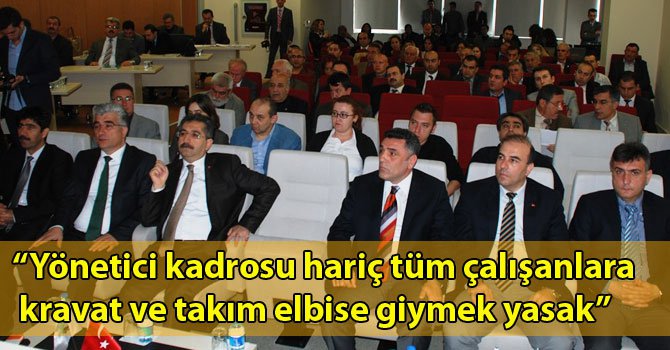 Çalıştayın birinci bölümünün sonunda bir kapanış konuşması yapan Vali Zahteroğulları, üreticilere daha iyi hizmet götürebilmek için, sıkıntıları daha iyi anlayabilmek için tarımdaki yönetici kadrosu hariç tüm çalışanlara kravat ve takım elbise yasağı getirdi. İlgili Vali Yardımcısı Ayhan Kart’a da talimat veren Vali Zahteroğulları, “Ben Kaymakamlık yaptığım ilçelerde her kurumla ilgili bazı kararlar alıyordum. Bir tanesi de tarım teşkilatını ilçe müdürü de dahil takım elbise giymek yasak diyordum. Dairede oturmalarını istemiyordum. Devamlı arazide vatandaşlarımızın yanlarında olmalılardı. Eğer oturacaklarsa da kahvehanede vatandaşlarımızın yanında oturmalarını istiyordum. Vatandaşlarımız onlara rahat ulaşabilsin. Şimdi şehirde protokol işleri çok izninizle yönetici konumundaki arkadaşlar hariç, diğer tarım çalışanlarına kravat takıp, takım elbise giymeyi yasaklıyorum. Toplantılarda kimseye tarımdan gelen arkadaşlara takım elbiseniz niye yok diye sormasınlar. ” şeklinde konuştu.