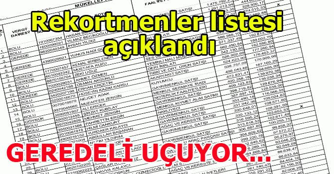 Bolu’da 2013 yılı gelir vergisi rekortmenleri belli oldu. Listenin başında Tarım Makineleri Satışı yapan Hasan Buyruk yer aldı. İkinci sırada her yıl listeye giren işadamı Yılmaz Becikoğlu yer aldı. Üçüncü sırada ise Geredeli deri imalatçısı İhsan Yıldız yerini aldı.