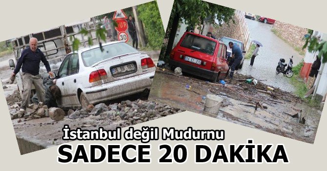 Mudurnu’da 20 dakika yağan yağmur ilçede hayatı felç etti. Çok sayıda ev ve işyerini su basarken, vatandaşlar eşyalarını kurtarmak için canla başla mücadele ettiler.