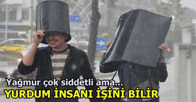 Bolu’da 45 dakika boyunca etkili olan yağmur yağışı sonrası hayat felç oldu. Yolları ve alt geçitleri su basarken, yağmura hazırlıksız yakalanan vatandaşlar saçakların ve alışveriş merkezlerine sığındılar. Bir vatandaş da kafasına kova geçirerek yağmurdan korundu.